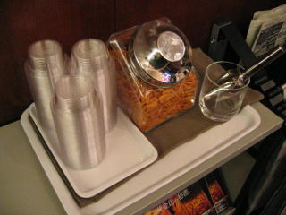 ラウンジはビール1本無料、おつまみの柿の種、コーヒーなども無料です。