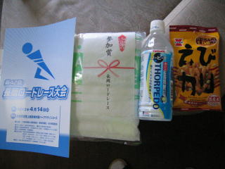 ナンバーカード、参加者名簿、参加賞のタオル、飲み物、おかき、入浴ご優待券です。