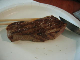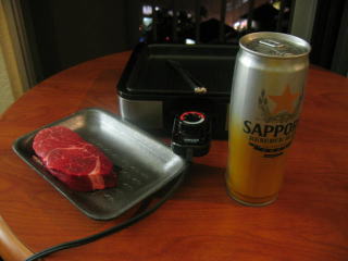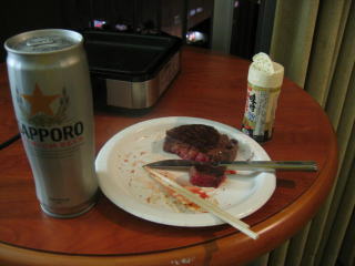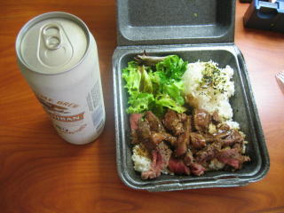荷物を解いた後、フードパントリー内の「ハイステーキ」でステーキ弁当やビールを買ってきました。