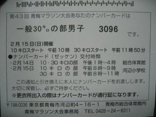 平成21年2月15日 東京都の「第43回青梅マラソン大会」の30キロに参加しました。