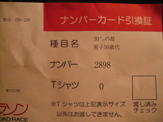 TシャツのサイズOをもらって、ナンバーカードをもらいます。