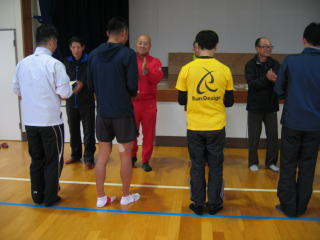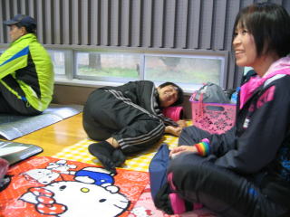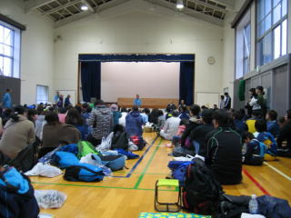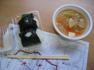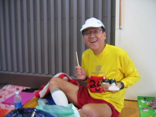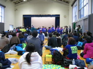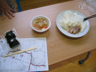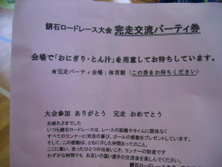 ゴールして一息ついて、通路を挟んで完走交流パーティ券を出して「おにぎり・とん汁」をいただきます。