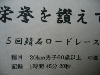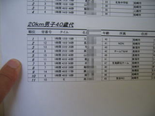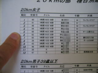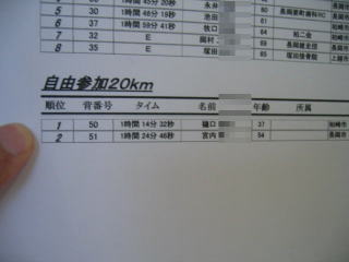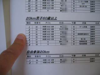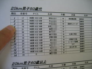 結果が張り出されました、姫ちゅは20キロ男子60歳以上で4位でした、1時間45分20秒でした。