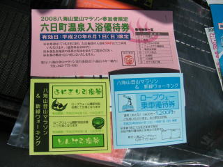 大会要綱、温泉入浴優待券、おにぎり&とん汁引換券、ロープウェー優待券です。