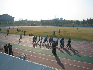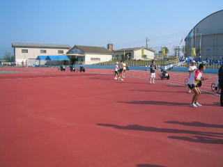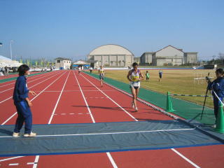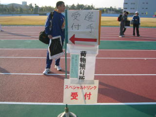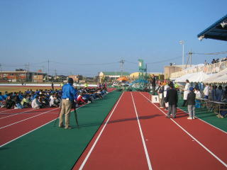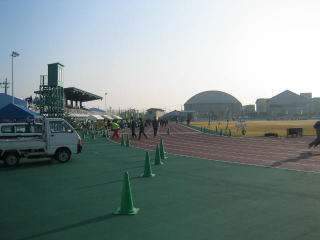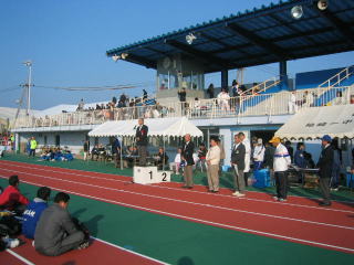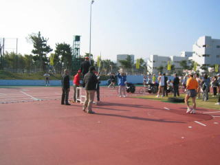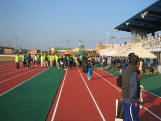 ゼッケンを付けてウオーミングアップ、400mトラックを軽く3周しました。