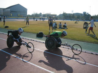 初めて見る車イスの選手のウオーミングアップ。