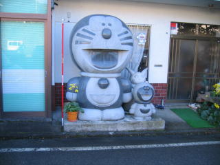 駅前のお土産物屋さんに大きなドラえもん、小さなドラえもん、ピカチューが歓迎です。