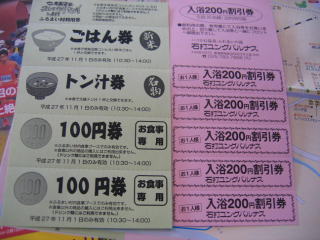 おもてなしは「ごはん券」、「トン汁券」、「100円券お食事専用」2枚、入浴200円割引券5枚です。