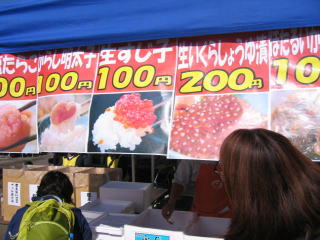 「100円券お食事専用」2枚で「はりまやメンチ100円」と「生すじこ100円」を買いました。