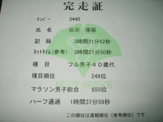 スタートから3時間21分50秒後(ネット)、3時間21分52秒(グロス)でゴールしました。