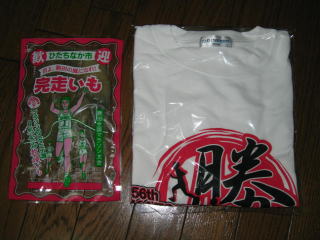 参加賞の「完走いも(乾燥いも)」と派手なTシャツです。