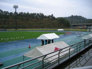 雨の中、定刻の午前10時スタートし、陸上競技場を1周と3/4周してロードへ出ます。