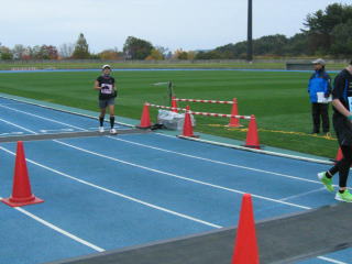 39キロ過ぎて前方の赤いウェアーのランナーを追いますが、追いつくことなく、陸上競技場へ入り、ゴールです。