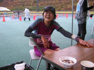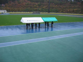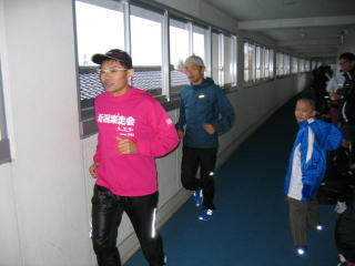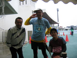 午前10時、小雨の中を男女一斉スタート、陸上競技場を2周弱、周回してロードに出ます。