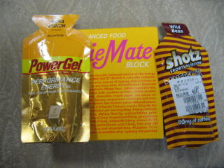20キロ用と30キロ用のショッツとパワージエルはポケット、カロリーメイトはスタート前の朝食予備です。