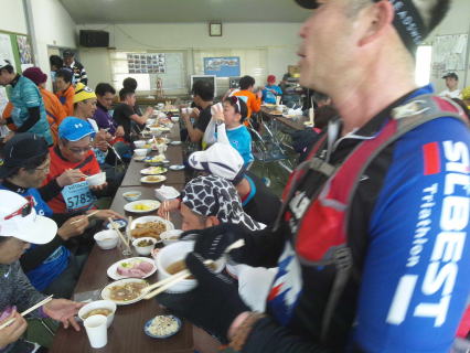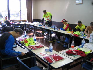 集会場内はまるで食堂の様子、とてもフルマラソンの給水所の様には見えません、ウルトラならあり得るかもといった感じです。