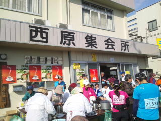 おばちゃんたちが「休憩していきなさい」って言ってますが、「ほんとはフルマラソンで休憩してはダメでしょ」とも思いながらお言葉に甘えます。