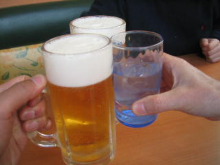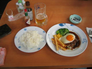 やっと会えました、車でホテル隣のデニィーズへ移動、祝杯とお昼ご飯にします。
