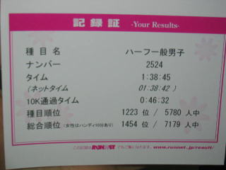 記録は1時間38分45秒、ネットでは1時間38分42秒、自己新記録です。