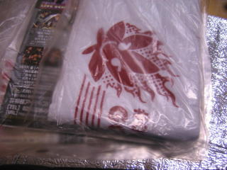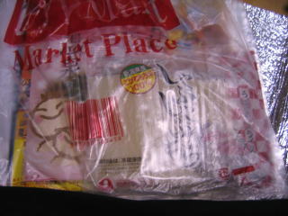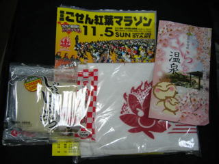 アリーナ入り口でナンバーカードチェックでいただいた参加賞、お餅やタオル、大会プログラムなどが見えます、袋に入れてあるのがありがたい。