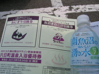 おにぎり、魚沼きのこ汁引換券やお水、温泉入浴優待券などが付いています。