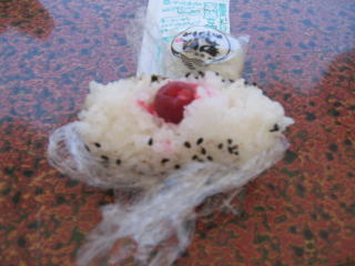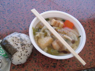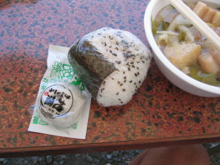 引換券でおにぎり、きのこ汁、他にお饅頭、青汁をいただきました。