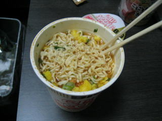 午前4時20分起床、カップヌードル大盛とバターロール、コーヒーで質素な朝食です。