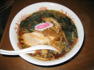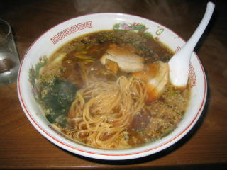 背脂の入った濃口醤油スープに、カレーラーメンと同じ黄色い透明な麺、チャーシュー、ナルトなどが入っています。