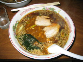 背脂醤油ラーメンにカレールー、ほうれん草、チャーシューなどが入っています。