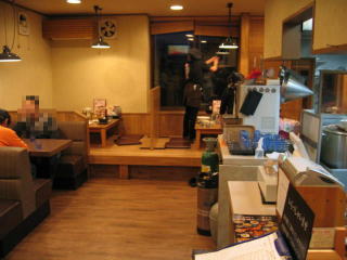 店内は中央に厨房とカウンター席、手前側にボックス席、左奥が小上がり席です。