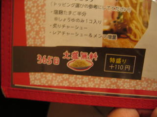 ラーメンは365日大盛無料、特盛は+110円です。