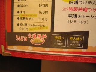 つけ麺も365日大盛無料、特盛は+110円、特大盛は+210円です。