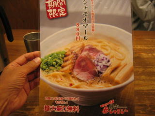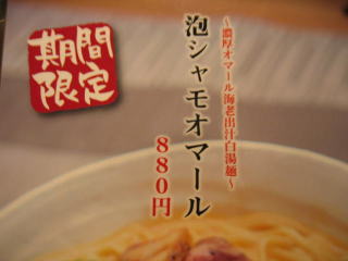今日のお目当ては期間限定「泡シャモオマール」880円、麺大盛無料です。
