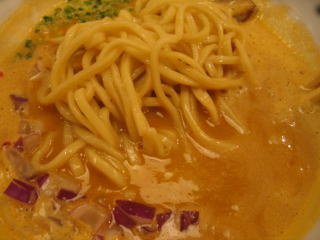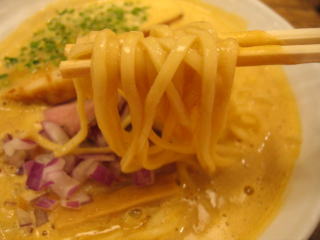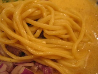 紫タマネギや太麺のメンマ、万能ねぎなども見えます。