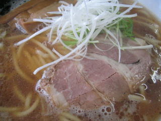 ちょっと冷たいチャーシュー、大きなメンマ、のり万能ネギ、長ネギなどが載っています。