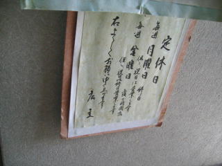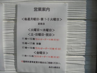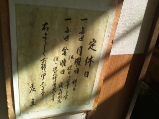 定休日などが書いてあります、「毎週月曜日休日、但し祝日は営業します。