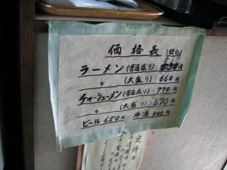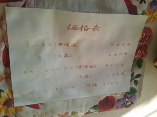 価格表は極めてシンプル、ラーメンとチャーシューメンの普通盛と大盛のみです。