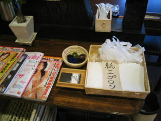 荷物置きのカゴや紙エプロンなどもあり親切です。