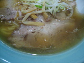 豚骨っぽいラードが浮いて、魚出汁のコクがある塩醤油といった複雑な美味しいスープです。