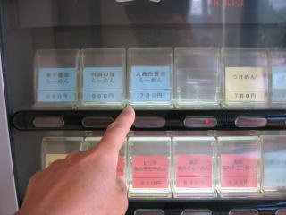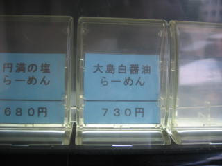 左上から青いボタンで「煮干醤油らーめん680円」、「円満の塩らーめん680円」、「大島白醤油らーめん730円」と並んでいます。