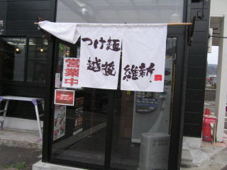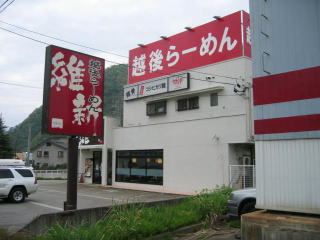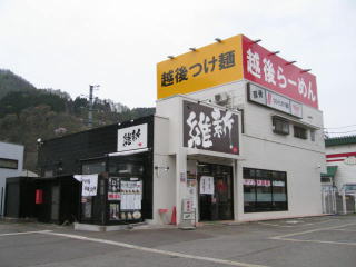 建物の正面入口が「越後らーめん維新」さん、脇の黒い入口が「越後つけ麺維新」さんです。