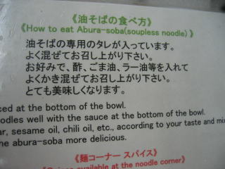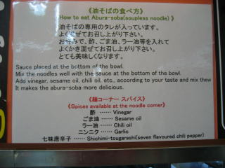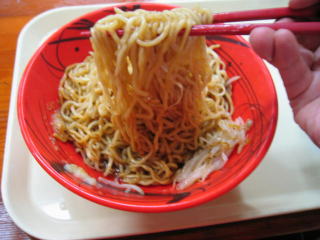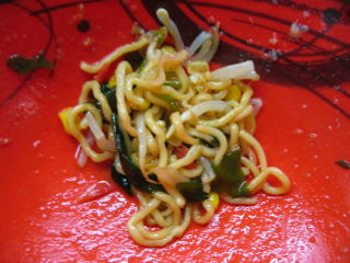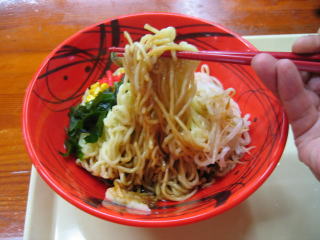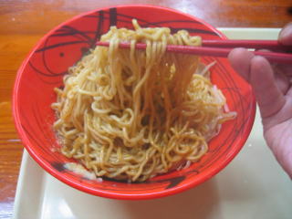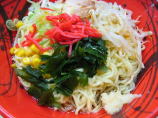 麺コーナーの前で、酢、ごま油、ラー油、ニンニクを適当に入れてきました。