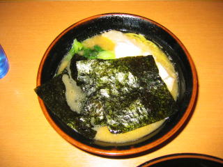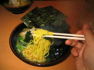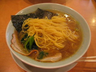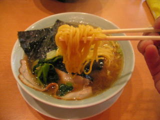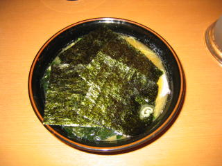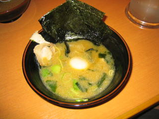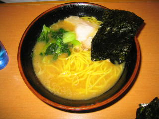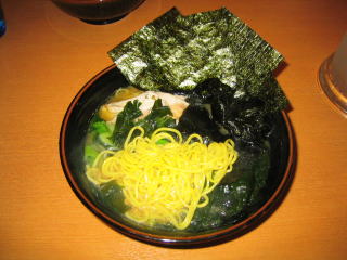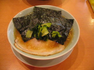 家系ラーメンらしく?、とんこつ醤油に薄いチャーシューがついて、海苔で覆ってあります。