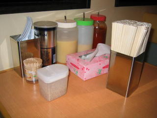 テーブルの上の薬味類、手前のタッパーは白ゴマです。