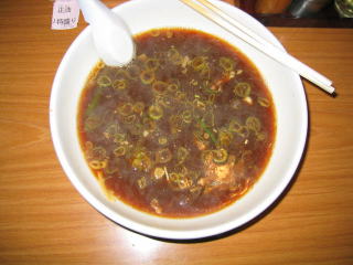 濃い色のスープ、しょうがの香りがします。切り落としのチャーシューがたくさん入っています。
