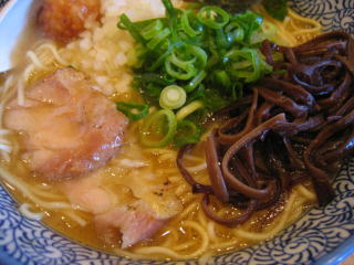 鶏チャーシュー、海苔、キザミネギ、キクラゲ、つくねなどが載っています。
