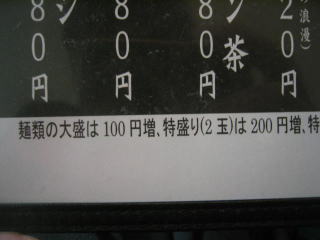 「麺類の大盛は100円増、特盛り(2玉)は200円増、」