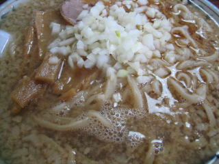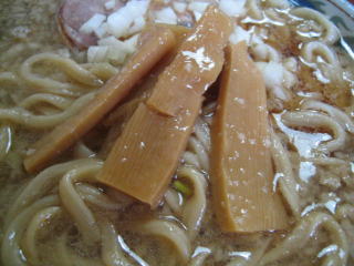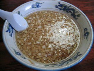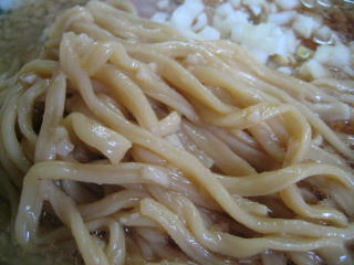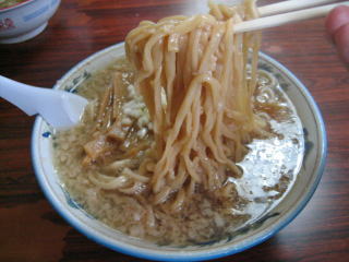 背脂がたっぷり入った、煮干の効いたしょっぱめの醤油スープです。