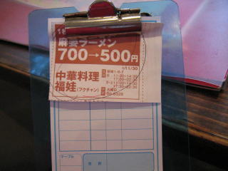 今日はクーポン使用で「麻婆ラーメン」が700円→500円です。