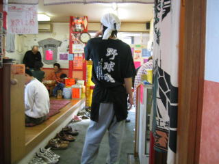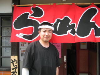 「自家製ラー油辛口」と書いてあります。ねじりハチマキの赤シャツの若大将が一生懸命ラーメンを作っていました。